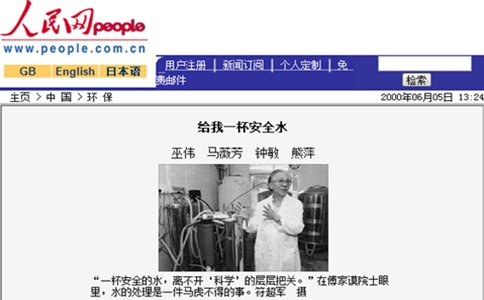 2000年6月5日,人民網(wǎng)發(fā)表了一篇《南方日?qǐng)?bào)》對(duì)水杯子名譽(yù)董事長傅家謨?cè)菏康牟稍L報(bào)道,講述了將飲水與用水分開,采用深度處理技術(shù)提高飲水品質(zhì),解決飲水污染問題。